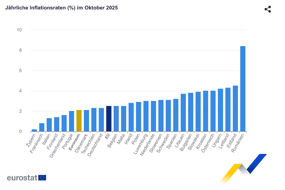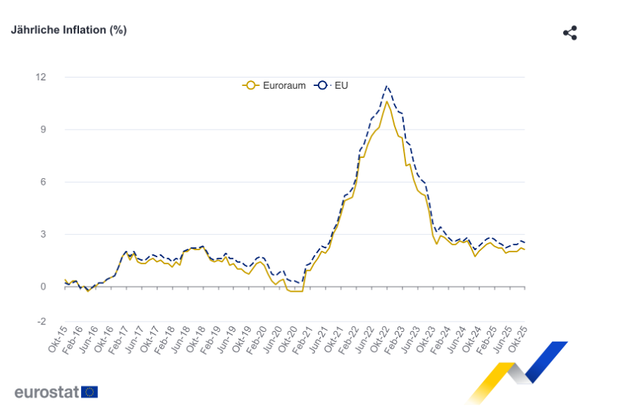 Gerade hat Eurostat die Zahlen für die europäische Inflationsrate im Oktober bestätigt. Mit 2,1 Prozent liegt sie exakt dort, wo die Notenbank sie gerne sieht, nämlich ganz nah beim Ziel von zwei Prozent. Man sieht in dem Original-Schaubild von Eurostat auch sehr schön, dass es seit Ende des Jahres 2023 schon eine völlig ruhige flache Entwicklung der Preise in Europa entlang der zwei-Prozent-Linie gibt (Abbildung 1). Das, was viele als „Inflation“ bezeichnet hatten, war eindeutig ein kurzes temporäres Ereignis.