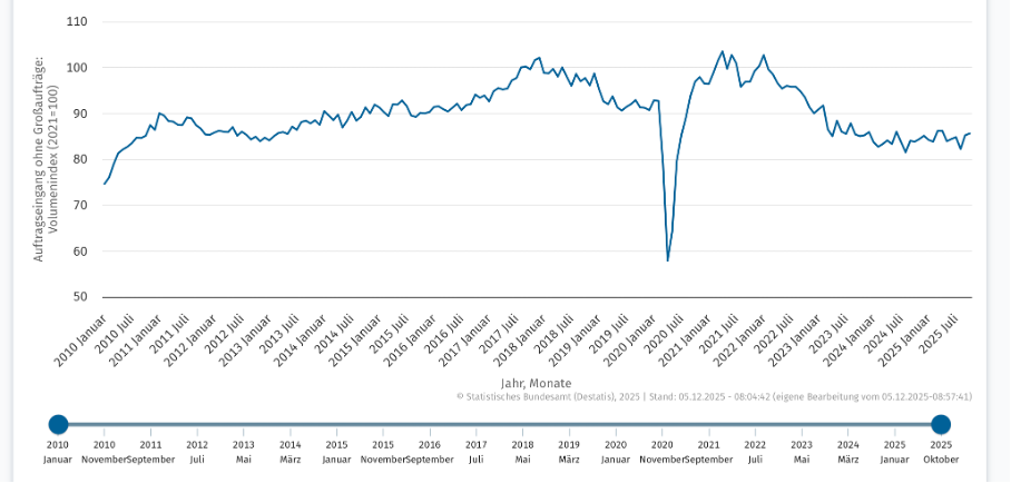 Ohne solche Großaufträge verharrt die deutsche Wirtschaft, wie das Original-Schaubild des Bundesamtes zeigt, weiter auf der Rezessionstalsohle. Damit hat die deutsche Wirtschaft bald das vierte Jahr einer rezessiven Entwicklung vollendet (die letzte Spitze über einem Wert von einhundert im Jahr 2022 ist der Wert von Januar 2022).