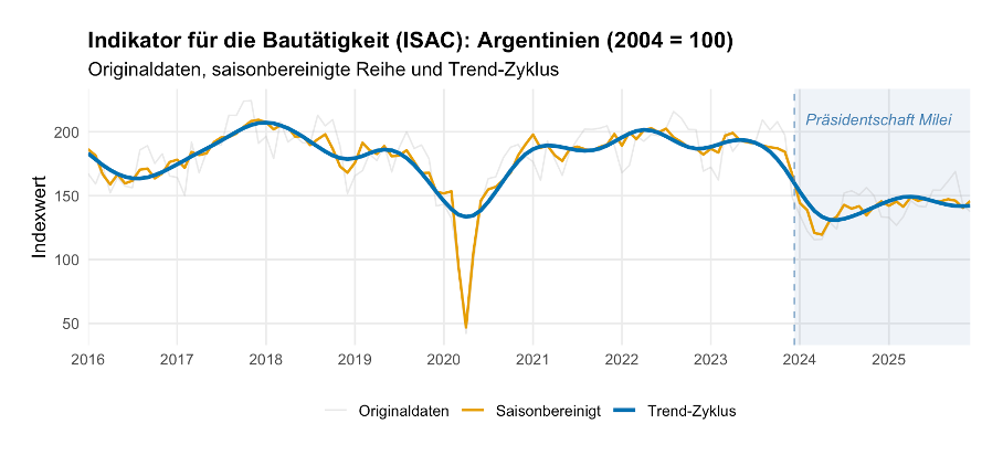 Nicht anders als in der Industrie sieht es in der Bauwirtschaft aus (Abbildung 2). Auch hier hat das Jahr 2025 keineswegs die erhoffte Wende zum Besseren gebracht. Zwar gab es eine leichte Erholung nach dem absoluten Tiefpunkt im Jahr 2024, von einer Wende oder gar einem Aufschwung kann aber nicht die Rede sein. Dass auch in der Bauwirtschaft im Jahresvergleich ein Plus von 4,4 Prozent steht, hat, wie die Abbildung unzweideutig zeigt, ebenfalls nichts mit einem „Aufschwung durch Bürokratieabbau“ zu tun, als vielmehr mit dem massiven Einbruch des Sektors im Jahr 2024, als es mit 17,5 Prozent einen Einbruch gab, der in seiner Größenordnung einer Depression gleicht. Argentinien ist ausweichlich des Verlaufs dieser Kurve weiterhin in einer tiefen Rezession.