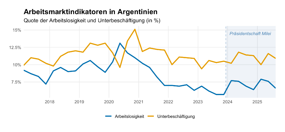 Diese Erosion der realwirtschaftlichen Basis schlägt sich noch relativ moderat in der Beschäftigungsstatistik nieder. Es gibt allerdings keine Informationen darüber, ob und wie viele Argentinier sich gar nicht mehr als arbeitslos oder unterbeschäftigt melden. Die vorhandenen Zahlen zu Arbeitslosigkeit und Unterbeschäftigung liegen zwar noch unter den Rekordwerten zur Zeit des Corona-Schocks, befinden sich mit 6,6, resp. 10,9 Prozent aber auf einem Niveau, das höher ist als in der Zeit vor der Wahl Mileis (Abbildung 3). Auch hier ist es offensichtlich, dass es keine Kräfte gibt, die eine Wende zum Besseren herbeiführen könnten.