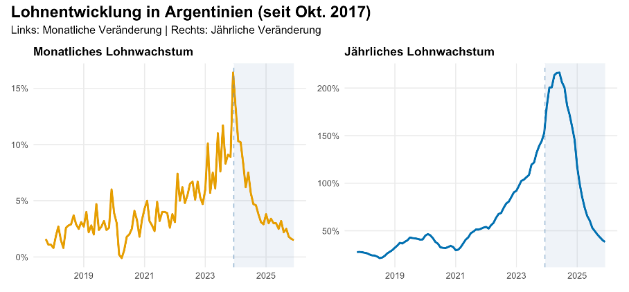In einer bemerkenswerten Kehrtwende stoppte die Regierung Milei die Einführung der neuen Methodik unmittelbar nach Lavagnas Rücktritt. Caputo begründete dies damit, man wolle „Spekulationen über Manipulationen“ vermeiden und die Umstellung erst vollziehen, wenn der Prozess der Desinflation „vollständig konsolidiert“ sei. Dass die Zentralbank bereits vor „Unsicherheiten“ im Ausblick gewarnt hatte, falls die neue Formel höhere Werte ausspuckt, lässt die Entscheidung in einem anderen Licht erscheinen. Doch aufgrund der politischen Intervention bleibt die Inflationsrate vorerst bei knapp 3 Prozent pro Monat hängen, während Analysten vermuten, dass die reale Teuerung bei einer ehrlichen Gewichtung von Mieten und Strompreisen längst wieder an Fahrt aufgenommen hat. Das Narrativ vom Sieg über die Inflation erweist sich damit zunehmend als Produkt statistischer Schützenhilfe. Auch die Nominallohnentwicklung, die zuletzt bei jährlichen Wachstumsraten von 40 Prozent lag, spricht dafür.