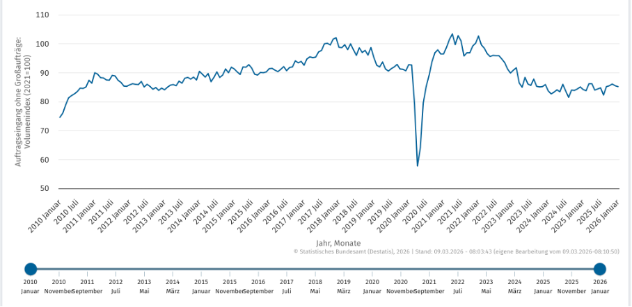 Und genau so ist es. Die Auftragseingänge in der deutschen Industrie sind von Dezember auf Januar um geschlagene 11 Prozent gesunken. Das ist ein wirklich herber Rückschlag, nachdem es in den letzten Monaten des vergangenen Jahres, vor allem bedingt durch Großaufträge aus dem militärischen Bereich, so aussah, als würde sich die deutsche Wirtschaft leicht erholen. Klar, dass niemand in der Regierung, die ihre Rüstungsaufträge schließlich heftig abgefeiert hat, es für angemessen hielt, dem Wahlvolk kurz vor einer wichtigen Entscheidung, die Stimmung zu verderben.
