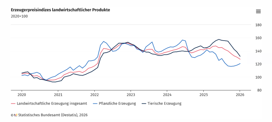 In übrigen ist diese schöne neue Welt fallender Lebensmittelpreise (auf der Erzeugerstufe) schon wieder in Gefahr. Der völkerrechtswidrige amerikanisch-israelische Angriffskrieg gegen den Iran kann sehr schnell zunichte machen, was an Normalisierung in diesem Bereich in den letzten Jahren gelungen ist.